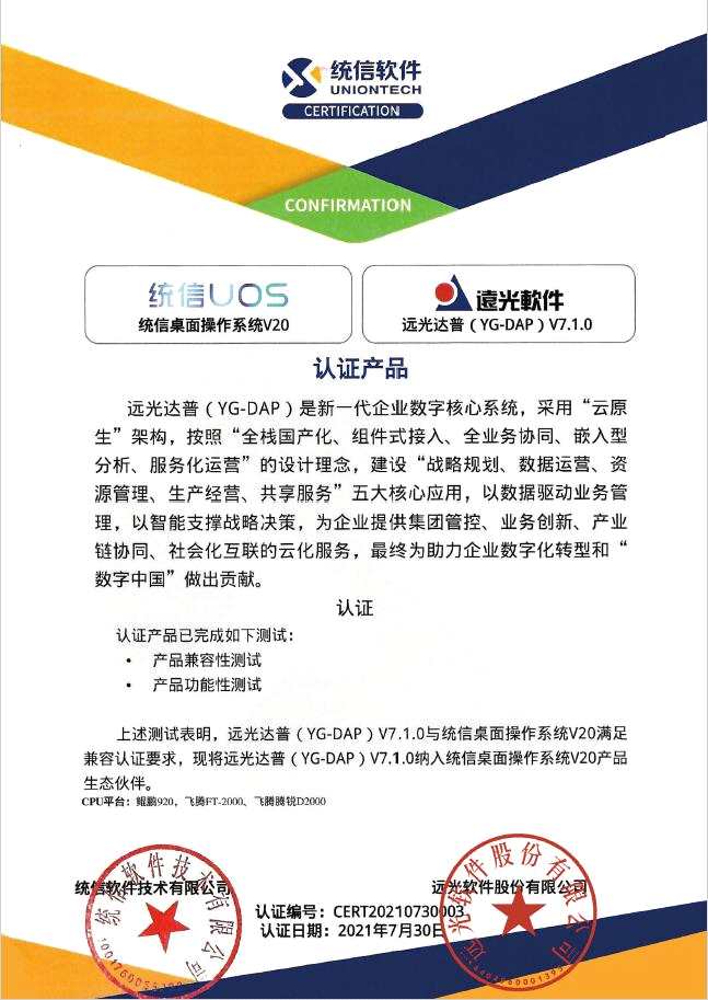 遠(yuǎn)光達(dá)普(YG-DAP)通過統(tǒng)信桌面操作系統(tǒng)V20兼容認(rèn)證
