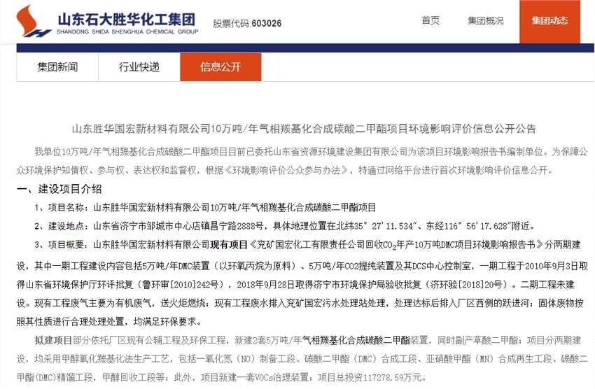 8月16日,據(jù)石大勝華(603026)(603026)官網(wǎng)披露,公司與兗礦集團合資子公司――山東勝華國宏新材料有限公司10萬噸/年氣相羰基化合成碳酸二甲酯項目目前已委托山東省資源環(huán)境建設(shè)集團有限公司為該項目環(huán)境影響報告書編制單位。為保障公眾環(huán)境保護(hù)知情權(quán)、參與權(quán)、表達(dá)權(quán)和監(jiān)督權(quán),根據(jù)《環(huán)境影響評價公眾參與辦法》,特通過網(wǎng)絡(luò)平臺進(jìn)行首次環(huán)境影響評價信息公開。
