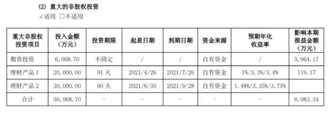 秦安股份半年報(bào)顯示,上半年?duì)I業(yè)收入6.59億元,同比增長(zhǎng)105.81%;凈利潤(rùn)1.09億元,同比下降56.53%;秦安股份上半年已投資5億元于購(gòu)買理財(cái)產(chǎn)品,并同時(shí)投資6000萬元開展期貨套期保值業(yè)務(wù),期神之路還在延續(xù)...