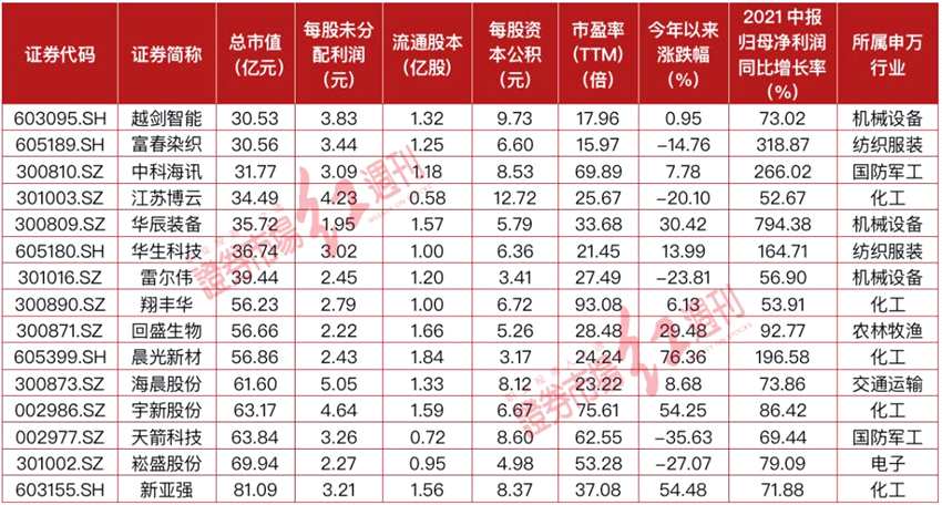 分析同花順(300033)高送轉(zhuǎn)預(yù)期板塊內(nèi)15只標(biāo)的股,他們都有三個(gè)共同特征。首先,從市值看,它們的市值范圍分布在30億至90億元之間,屬于較為典型的小盤股;其次,從上市日期看,均為2019年底之后上市,也就是次新股;再從業(yè)績表現(xiàn)看,這些公司歸母凈利潤同比增長幅度均在50%以上,符合高送轉(zhuǎn)新規(guī)掛鉤業(yè)績的要求。(見表1)