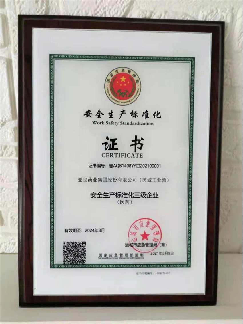 8月19日,亞寶芮城工業(yè)園榮獲運城市應急管理局頒發(fā)的“安全生產(chǎn)標準化三級企業(yè)”證書,這是運城市醫(yī)藥行業(yè)首張安全生產(chǎn)標準化證書。