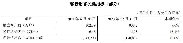 財(cái)富客戶數(shù)突破百萬(wàn)戶,達(dá)到102.39萬(wàn)戶,較上年末增長(zhǎng)9.6%;私行達(dá)標(biāo)客戶6.48萬(wàn)戶,較上年末增長(zhǎng)13.1%;