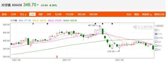 隨著片仔癀一波“爆火”之后,市場逐漸冷卻下來,片仔癀的股價也從7月份的最高位一路下滑,今日亦是難逃醫(yī)藥行業(yè)整體頹勢,下跌8.36%,收于346.7元。
