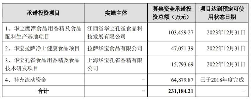 據(jù)華寶股份2021年3月19日公布的最新募投項(xiàng)目實(shí)施方案公告,公司上市前承諾募投的三個(gè)項(xiàng)目中,華寶鷹潭食品用香精及食品配料生產(chǎn)基地項(xiàng)目募投資金10.3億元,至2020年年底僅投入募資近1億元;華寶拉薩凈土健康食品項(xiàng)目承諾投資4.7億元,其投入募集資金僅1917.36萬(wàn)元;華寶孔雀食品用香精及食品技術(shù)研發(fā)項(xiàng)目計(jì)劃投入資金1.58億元,至去年年底僅投入17.05萬(wàn)元。其累計(jì)募投資金還不到1.2億元。