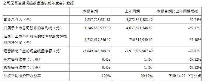 上半年,公司基本每股收益0.453元/股,同比減少69.12%;加權平均凈資產(chǎn)收益率5.20%,同比下降14.97個百分點。