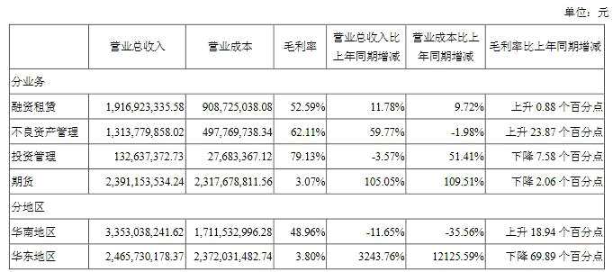 分地區(qū)來看,華南地區(qū)毛利率48.96%,同比上升18.94個百分點;華東地區(qū)毛利率3.80%,同比下降69.89個百分點。