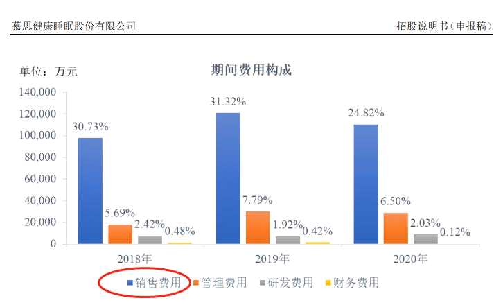 紅星資本局從招股書發(fā)現(xiàn),慕思股份報(bào)告期內(nèi)銷售費(fèi)用分別為9.79億元、12.09億元和11.05億元,銷售費(fèi)用率分別為30.73%、31.32%和24.82%,遠(yuǎn)超行業(yè)可比公司。最近三年同行可比上市公司如【喜臨門(603008)、股吧】(603008)(603008.SH)、夢(mèng)百合(603313)(603313.SH)、顧家家居(603816)(603816.SH)的銷售費(fèi)用率平均值分別為18.34%、17.22%及16.44%。