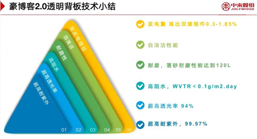 透明背板組件面世以來,經(jīng)過多方,多地區(qū),不同氣候區(qū)對比,采用透明背板雙面組件較雙玻雙面組件發(fā)電量高0.3.85%不等,透明背板的優(yōu)勢進一步凸顯。中來以創(chuàng)新技術推動大尺寸背板組件降本提質,踐行公司“少消耗,多發(fā)電”理念,豪博客2.0透明背板具備自清潔能力和高透光率,減少電站維護成本,增加光伏發(fā)電量。