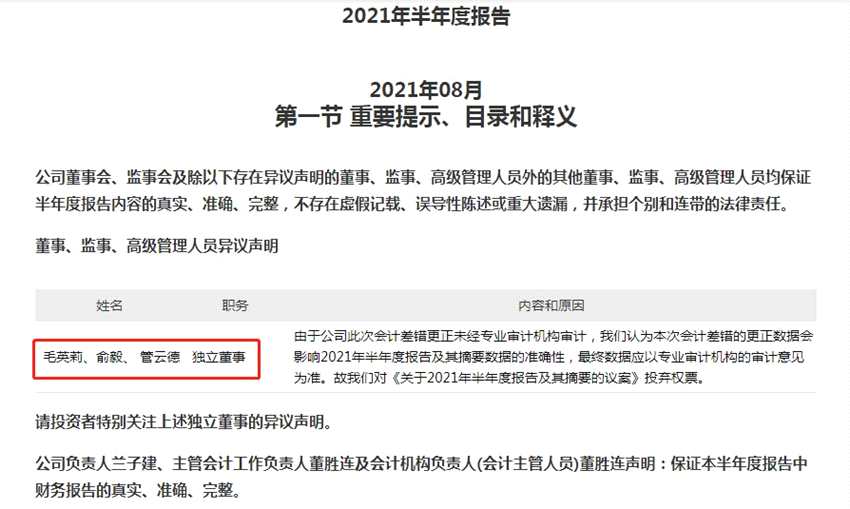 8月20日晚間,星星科技發(fā)布了公司2021年半年報。毛英莉、俞毅、管云德三位獨立董事對半年報提出異議聲明。原因是,公司對前期會計差錯進(jìn)行更正,由于公司此次會計差錯更正未經(jīng)專業(yè)審計機(jī)構(gòu)審計,三位獨董認(rèn)為,本次會計差錯的更正數(shù)據(jù)會影響2021年半年度報告及其摘要數(shù)據(jù)的準(zhǔn)確性,最終數(shù)據(jù)應(yīng)以專業(yè)審計機(jī)構(gòu)的審計意見為準(zhǔn)。故對《關(guān)于2021年半年度報告及其摘要的議案》投棄權(quán)票。