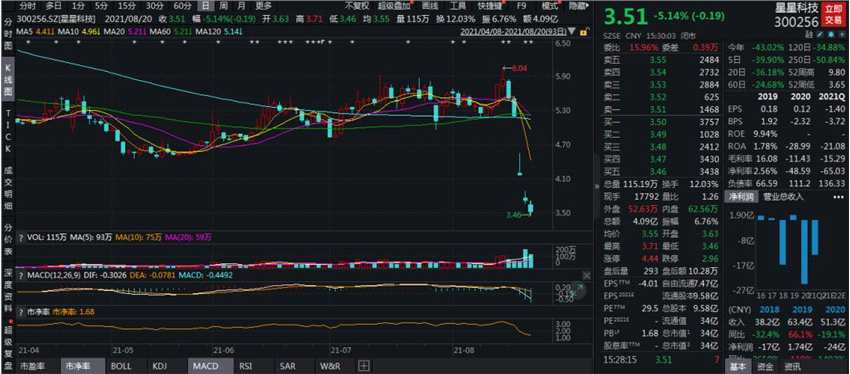 從二級市場表現(xiàn)看,數(shù)據(jù)顯示,近期,星星科技股價連日大幅下挫,周跌幅達(dá)到39.9%。截至8月20日收盤,公司股價報3.51元/股,收跌5.14%。