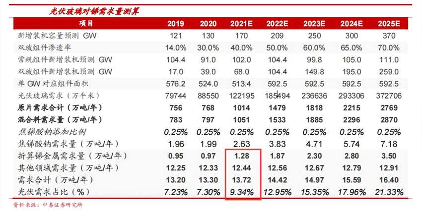 據(jù)玻璃網(wǎng)資訊數(shù)據(jù)顯示,光伏玻璃制造過(guò)程中,焦銻酸鈉一般需要添加混合料質(zhì)量的0.2%-0.4%。中泰證券表示,假設(shè)2025年光伏裝機(jī)量達(dá)到370GW,光伏玻璃領(lǐng)域?qū)︿R需求量將達(dá)到3.5萬(wàn)噸,2020-2025年復(fù)合增長(zhǎng)率為29%,光伏領(lǐng)域需求占比將從7.30%增至21.33%。