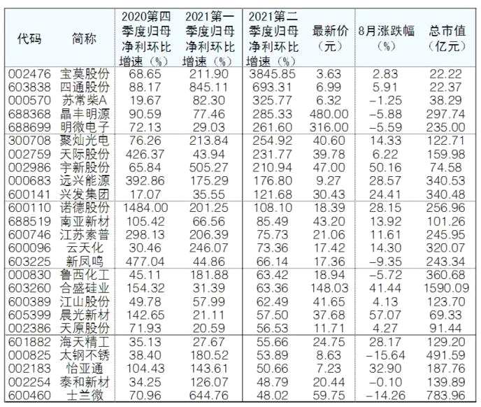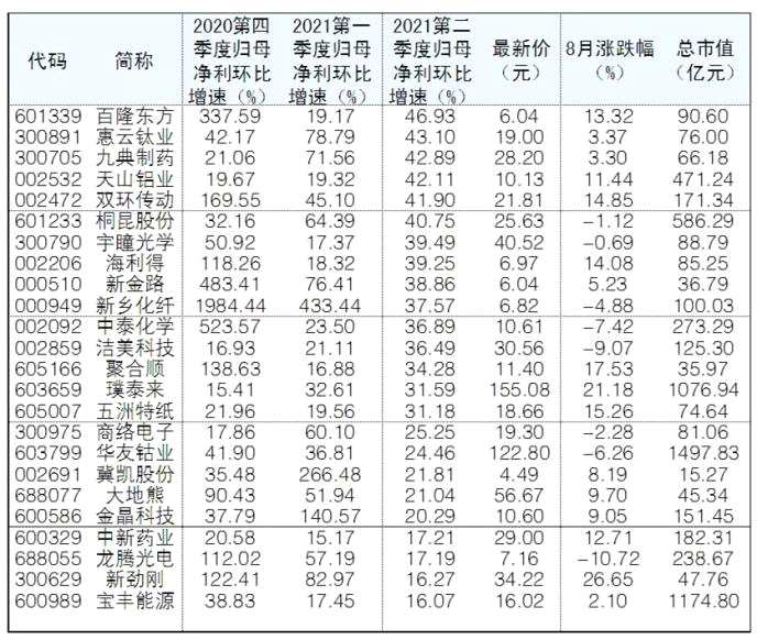 隨著中報加速披露,上市公司單季度業(yè)績逐漸清晰。根據(jù)Wind數(shù)據(jù)統(tǒng)計,截至昨日,49股自去年第四季度開始連續(xù)三個季度歸母凈利環(huán)比增速均超過15%。二級市場來看,晨光新材(行情605399,診股)、宇新股份(行情002986,診股)8月漲幅超50%。