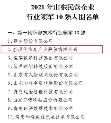 近日,山東省工信廳公布2021年山東民營企業(yè)行業(yè)領軍10強入圍名單,【金現代(300830)、股吧】(300830)信息產業(yè)股份有限公司(以下簡稱“金現代”,證券代碼:300830)成功入選新一代信息技術行業(yè)領軍10強,且位居名單第二位。
