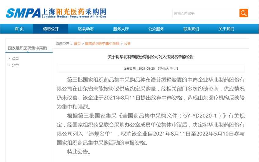 ▲8月20日,華北制藥(600812)因在山東省未能按協(xié)議供應(yīng)相關(guān)藥品約定采購(gòu)量,被公告列入“違規(guī)名單”。網(wǎng)絡(luò)截圖