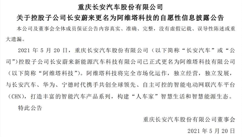 這則公告是關(guān)于長(zhǎng)安汽車子公司長(zhǎng)安蔚來更名為阿維塔科技(下稱“阿維塔”)的事宜,公告顯示,長(zhǎng)安蔚來在更名為阿維塔后,將完全市場(chǎng)化運(yùn)作,獨(dú)立運(yùn)營(yíng),獨(dú)立發(fā)展,與長(zhǎng)安汽車、華為、寧德時(shí)代攜手共創(chuàng)全球領(lǐng)先、自主可控的智能電動(dòng)網(wǎng)聯(lián)汽車平臺(tái)(CHN)等。