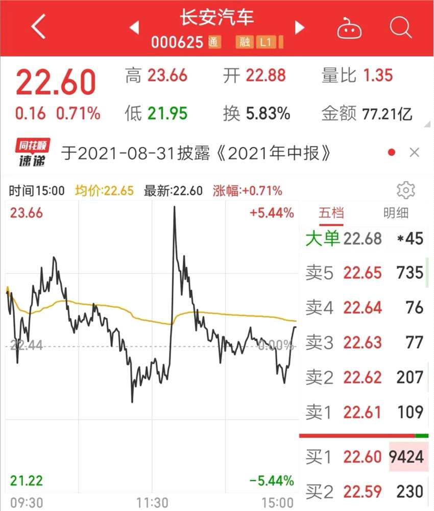 受上述消息影響,長(zhǎng)安汽車股價(jià)在午后開盤不久直線拉升,從下跌1.25%拉至上漲5.21%,但好景不長(zhǎng),隨后又回落到盤中一度翻綠,最終尾盤有所回升,收盤漲0.71%至22.6元,當(dāng)日汽車整車板塊指數(shù)上漲2.07%。