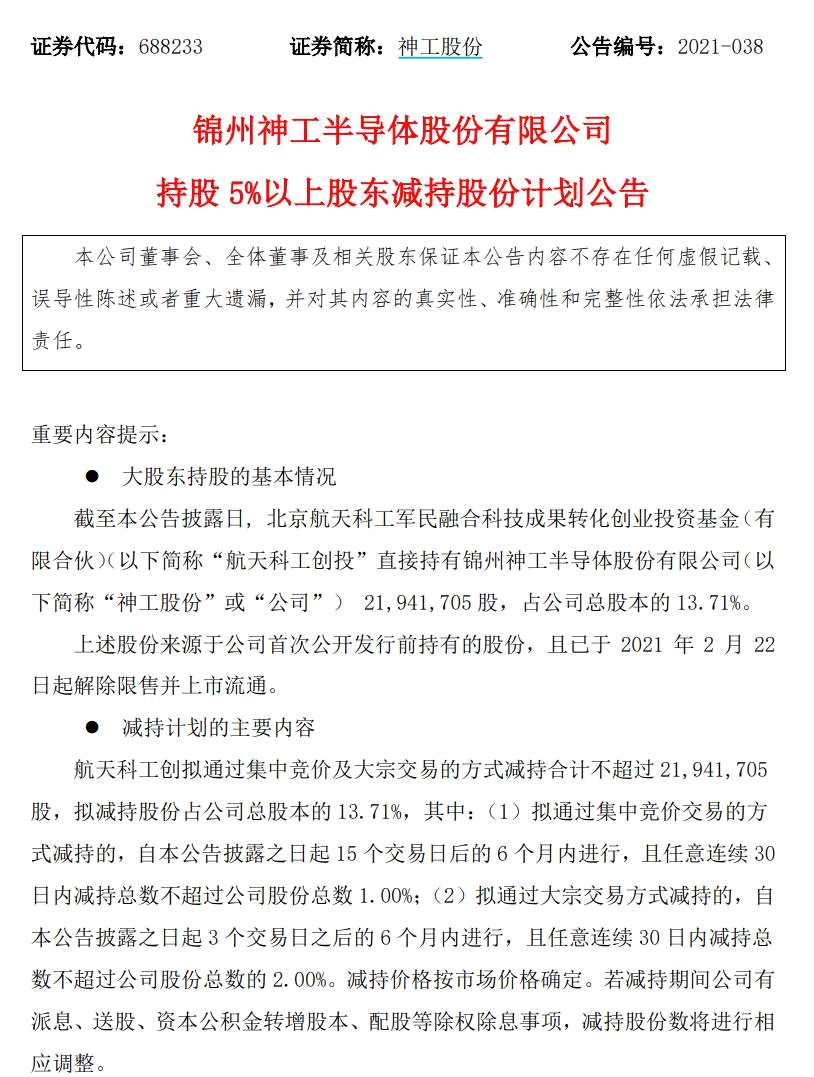 公告顯示,航天科工創(chuàng)投直接持有錦州神工半導(dǎo)體股份有限公司(以下簡稱“神工股份”或“公司”) 21,941,705股,占公司總股本的13.71%。