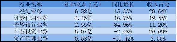 分業(yè)務來看,經(jīng)紀業(yè)務營業(yè)收入6.52億元,同比增長15.33%,占總數(shù)收入比例為28.64%;證券信用業(yè)務營業(yè)收入4.45億元,同比增長16.75%,占總數(shù)收入比例為19.55%;投資銀行業(yè)務營業(yè)收入2.55億元,同比增長84.96%,占總數(shù)收入比例為11.20%;自營投資業(yè)務營業(yè)收入6.07億元,同比增長-2.43%,占總數(shù)收入比例為26.69%;自營投資業(yè)務營業(yè)收入6.07億元,同比增長-15.42%,占總數(shù)收入比例為2.55%。