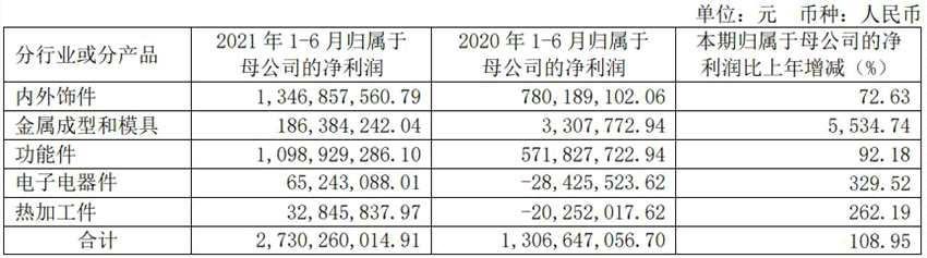 根據(jù)報(bào)告,1-6月,華域汽車(chē)各業(yè)務(wù)條線表現(xiàn)優(yōu)異,其主營(yíng)業(yè)務(wù)內(nèi)外飾件貢獻(xiàn)歸母凈利潤(rùn)13.47億元,同比增長(zhǎng)72.63%;金屬成型和模具利潤(rùn)貢獻(xiàn)同比暴漲5534.74%,其中電子電器件、熱加工件扭轉(zhuǎn)去年虧損態(tài)勢(shì),實(shí)現(xiàn)正盈利。