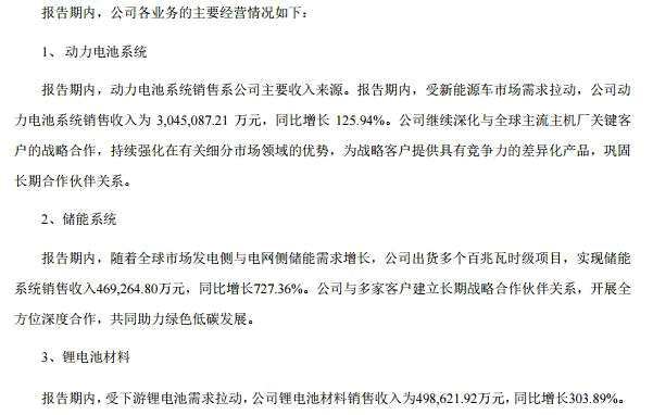 具體業(yè)務(wù)方面,動力電池系統(tǒng)業(yè)務(wù),在上半年受新能源車市場需求拉動,公司動力電池系統(tǒng)銷售收入為304.5億元,同比增長125.94%。儲能系統(tǒng)業(yè)務(wù)。上半年,隨著全球市場發(fā)電側(cè)與電網(wǎng)側(cè)儲能需求增長,公司出貨多個百兆瓦時級項目,實現(xiàn)儲能系統(tǒng)銷售收入46.9億元,同比增長727.36%。鋰電池材料業(yè)務(wù),受下游鋰電池需求拉動,上半年公司鋰電池材料銷售收入為49.86億元,同比增長303.89%。