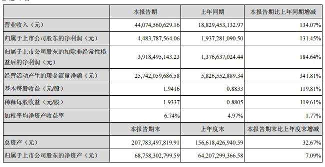 昨日盤后,寧德時代公布中報業(yè)績,公告顯示,上半年,公司實現(xiàn)營業(yè)收入440.7億元,同比增長134%;實現(xiàn)凈利潤44.8億元,同比增長131.5%。在扣除非經(jīng)常性損益后公司的凈利潤為39億元,同比增長184.64%。
