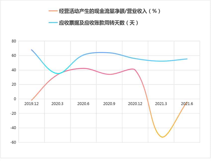 財報顯示,思瑞浦應(yīng)收賬款為2.21億,較上年年末增加192.55%;預(yù)付款項為9163萬,較上年年末增加 303.86%;存貨1.05億,金額較上年年末增加 49.02%;經(jīng)營活動產(chǎn)生的現(xiàn)金流量凈額為-2027萬元,較上年同期下降 115.87%,思瑞浦給出地解釋原因:一是集成電路行業(yè)上游產(chǎn)能趨緊的狀況,通過預(yù)付供應(yīng)商貨款的方式,保障供應(yīng)鏈的持續(xù)穩(wěn)定;二是公司人員增加及薪酬水平增長導(dǎo)致支付給職工及為職工支付的現(xiàn)金增長;三是公司內(nèi)銷銷售額同比大幅增加,導(dǎo)致繳納的增值稅大幅增加。從下圖可以明顯看出,思瑞浦現(xiàn)金流自2020年第四季度后斷崖式下跌,后有所反彈,但是依然為負。