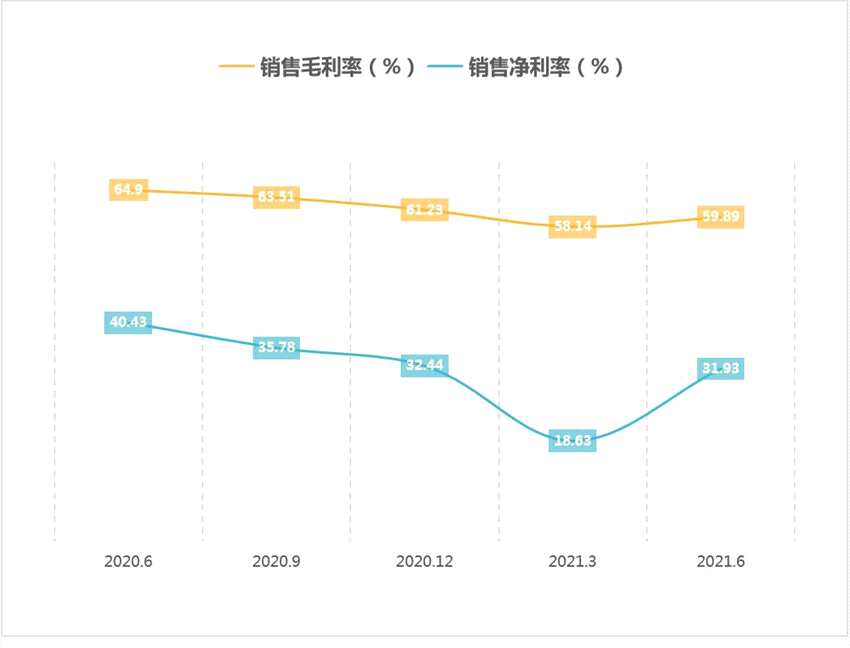 思瑞浦最新的毛利率和凈利率分別是59.89%和31.93%,如下圖所示,盡管同上一季度相比有所提升,但是從二者整體走勢來看,思瑞浦的毛利率正在走下坡路,受產(chǎn)品售價、產(chǎn)品結(jié)構(gòu)等因素影響,思瑞浦綜合毛利率較上年同期下降5.01 %,其中,信號鏈產(chǎn)品毛利率為 62.17%,電源產(chǎn)品毛利率為46.48%。
