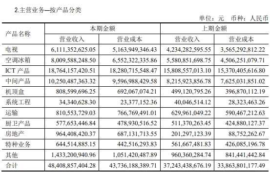 其半年報(bào)中并為披露毛利率。從往年來(lái)看,其2020年家電行業(yè)毛利率為9.05%,電視產(chǎn)品的毛利率為15.58%,機(jī)頂盒產(chǎn)品的毛利率為20.12%。