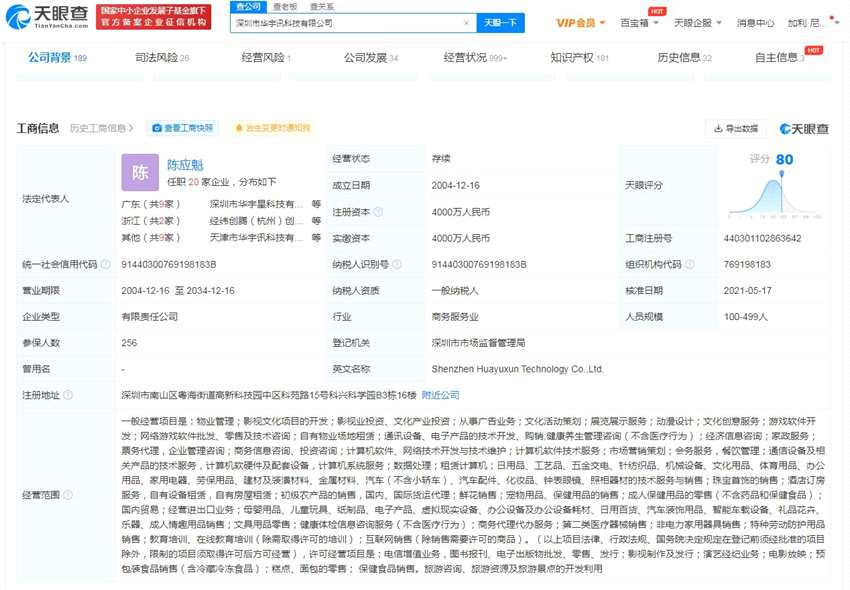 深圳市華宇訊科技有限公司成立于2004年12月,法定代表人陳應(yīng)魁,注冊(cè)資本4000萬人民幣,經(jīng)營范圍包括物業(yè)管理;影視業(yè)投資、文化產(chǎn)業(yè)投資等。股東信息顯示,該公司大股東為華誼兄弟(300027)互娛(天津)投資有限公司。