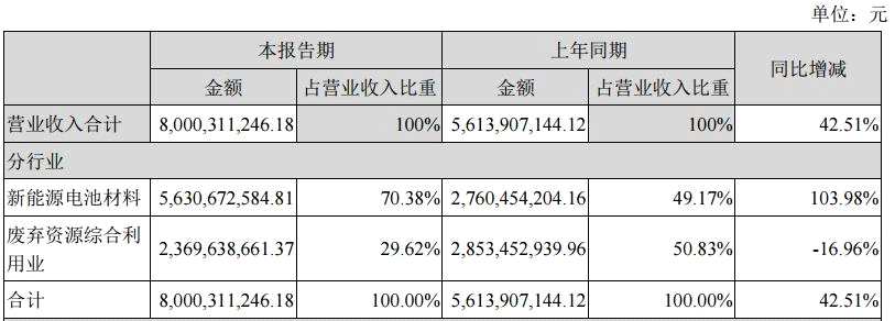分行業(yè)來看,今年上半年,格林美業(yè)績增長主要來自于新能源電池材料業(yè)務(wù),上半年實現(xiàn)營收為56.3億元,占公司總營收的70.38%,同比增長103.98%;廢棄資源綜合利用業(yè)務(wù)上半年營業(yè)收入?yún)s同比減少16.96%。這或許是由于原材料上游市場不斷漲價,導(dǎo)致中下游市場毛利率減少所致。