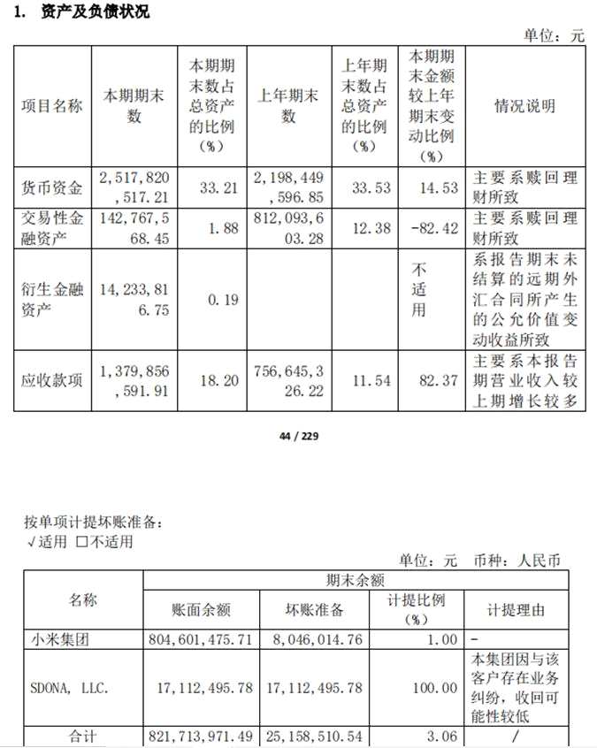 半年報顯示,截至2021年6月31日,九號公司應收賬款為13.79億元,占公司總資產(chǎn)的18.20%。其中小米集團占了8.04億元。