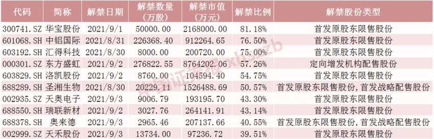 與當(dāng)前流通股相比,這6只股票下周解禁后流通盤將分別增加431.49%、765.00%、300.00%、159.85%、120.99%、580.23%,其中中鋁國(guó)際、圣湘生物、華寶股份、匯得科技流通盤將增加超300%。