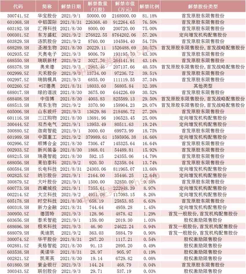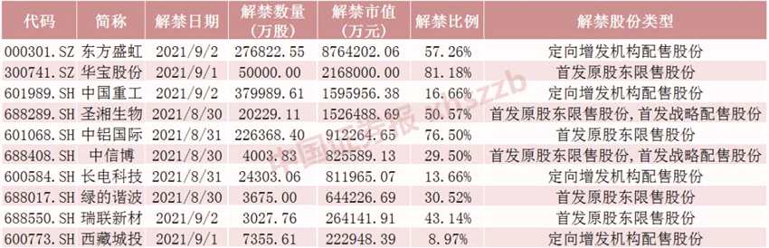 具體來看,數(shù)據(jù)顯示,東方盛虹9月2日將解禁27.68億股,均為定向增發(fā)機(jī)構(gòu)配售股份。華寶股份9月1日將解禁5億股,均為首發(fā)原股東限售股份。中國(guó)重工9月2日將解禁38億股,均為定向增發(fā)機(jī)構(gòu)配售股份?!?a href="http://m.xfjyyzc.com/gegu/688289/" target="_blank" title="圣湘生物(688289)股票分析,新聞,資金流向,財(cái)務(wù)數(shù)據(jù)" >圣湘生物(688289)、股吧】8月30日將解禁2.02億股,為首發(fā)原股東限售股份和首發(fā)戰(zhàn)略配售股份。