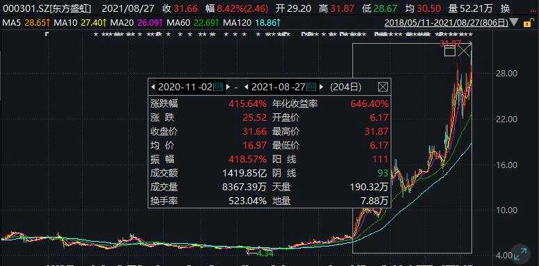 截至8月27日收盤,【東方盛虹(000301)、股吧】報(bào)31.66元/股,市值為1531億元,下周解禁的股份占總股本的57.26%,解禁后流通盤將增加159.85%。東方盛虹也是光伏EVA樹脂龍頭股,去年11月2日以來累計(jì)上漲415.64%。