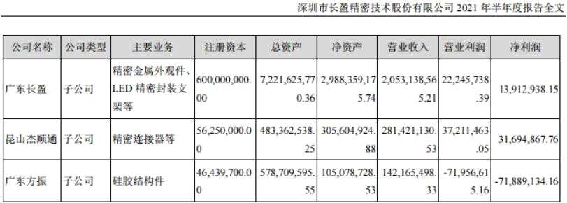 此外,長盈精密也在中報中披露了主要參股公司的經(jīng)營情況,包括廣東長盈精密技術(shù)有限公司,昆山杰順通精密組件有限公司,以及廣東方振新材料精密組件有限公司。其中廣東長盈實現(xiàn)凈利潤約1391.3萬元;昆山杰順通實現(xiàn)凈利潤約3169.5萬元;而廣東方振則虧損約7189萬元,超過前兩家子公司盈利之和,三家子公司合計凈虧損約2628萬元。