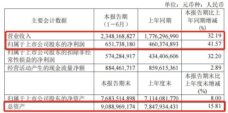 據(jù)財(cái)報(bào)數(shù)據(jù)披露,2021年1月至6月,該公司實(shí)現(xiàn)營收約為23.48億元,同比增長32.19%;實(shí)現(xiàn)凈利潤約為7.66億元,同比增長41%,歸母凈利潤則為6.52億元,同比增長為41.57%。而營收、凈利顯著增長之下,該公司的總資產(chǎn)也不斷增厚,較年初增長15.81%至90.89億元。