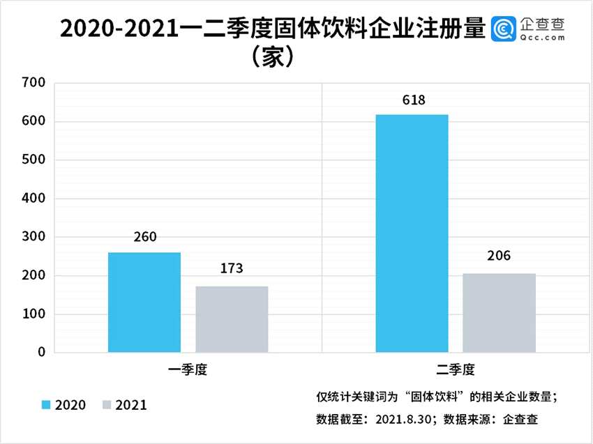 企查查數(shù)據(jù)顯示,2021年上半年共注冊固體飲料企業(yè)379家,同比減少57%。從季度來看,2021年一季度和二季度分別注冊固體飲料企業(yè)173家和206家。十年來首次呈現(xiàn)出減少趨勢。