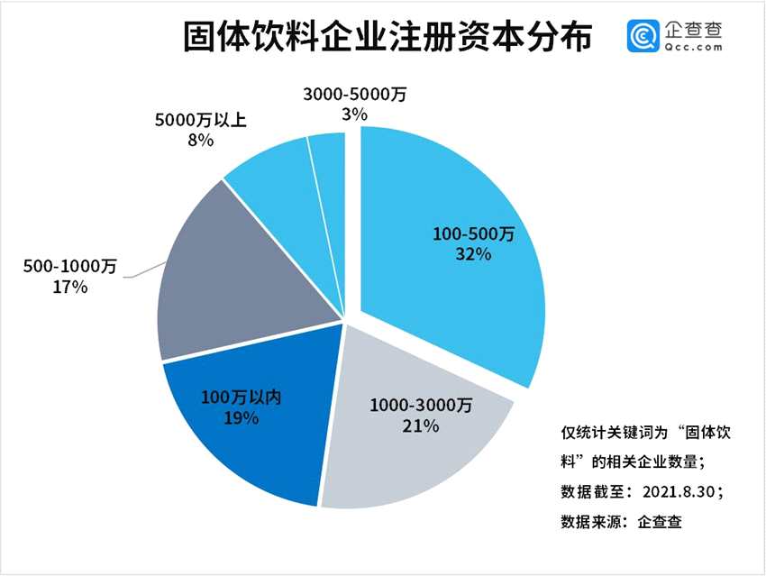 企查查數(shù)據(jù)顯示,從注冊資本來看,固體飲料企業(yè)注冊資本集中在100萬-500萬元,占比達(dá)32%,注冊資本在1000萬-3000萬元和100萬元以內(nèi)的分別占21%和19%。