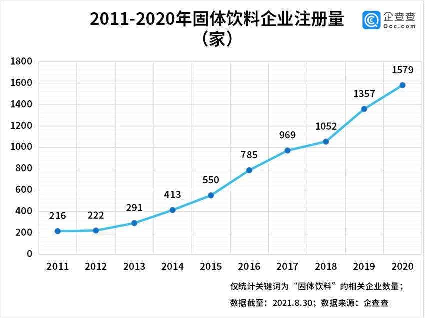 企查查數(shù)據(jù)顯示,2011年以來,固體飲料企業(yè)注冊量呈逐年增長趨勢,2020年共注冊相關(guān)企業(yè)1579家,同比增長16%。增長態(tài)勢平穩(wěn)。