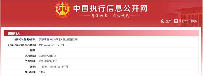 燕京啤酒子公司疑因銷售返利糾紛成被執(zhí)行人 執(zhí)行金額1486元