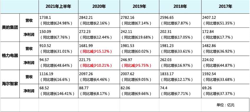 回顧“三巨頭”近年業(yè)績可以看出,美的集團(tuán)的基本面最為平穩(wěn),營收和凈利潤自2017年-2021年上半年都有不同程度的增長。