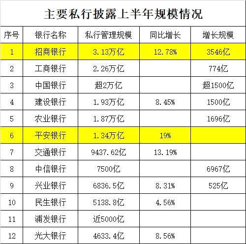 招行、四大國(guó)有銀行之后,是快速發(fā)展的平安銀行,上半年底私行規(guī)模達(dá)到1.34萬(wàn)億元,增速19%,客戶數(shù)達(dá)到6.48萬(wàn)戶,增長(zhǎng)13.1%。交通銀行(601328)私行規(guī)模達(dá)到9428億元,快逼近萬(wàn)億,中信銀行(601998)、興業(yè)銀行(601166)、民生銀行(600016)都超過(guò)5000億元,保持著繼續(xù)增長(zhǎng);浦發(fā)銀行(600000)近5000億元,光大銀行(601818)4633億元,都在增長(zhǎng)。