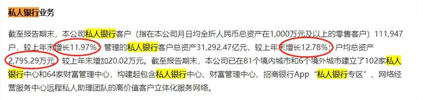 私行一哥招行的半年報(bào)顯示,按照在招行1000萬(wàn)資產(chǎn)以上的門檻,私行客戶數(shù)達(dá)到11.19萬(wàn)戶,較上年末增長(zhǎng)11.97%;管理的私人銀行客戶總資產(chǎn)3.13萬(wàn)億元,較上年末增長(zhǎng)12.78%;戶均總資產(chǎn)2,795.29萬(wàn)元,較上年末增加20.02萬(wàn)元。