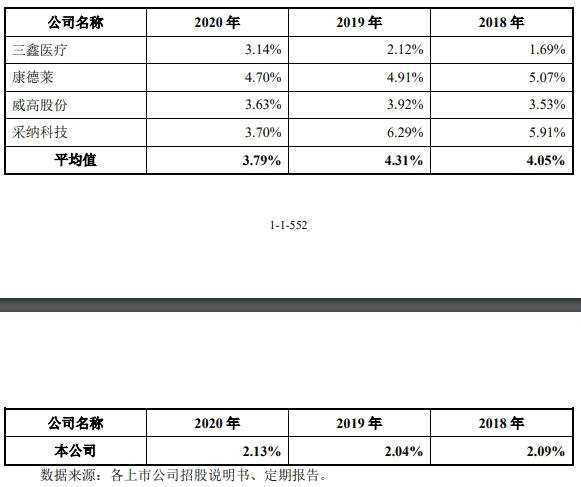 在研發(fā)投入上,宏宇五洲也遠(yuǎn)低于同行。2020年,三鑫醫(yī)療、康德萊、威高股份、采納科技研發(fā)費(fèi)用率均超過(guò)3%,其中康德萊最高為4.7%,平均值為3.79%,而宏宇五洲僅為2.13%。