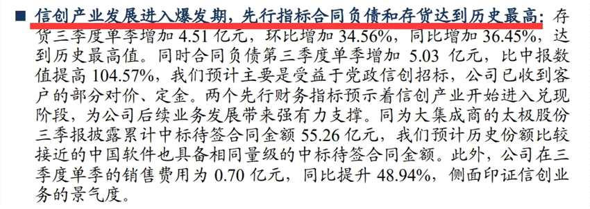 關于這兩項數(shù)據(jù),東吳證券曾點評中國軟件2020年三季報時指出,該公司合同負債和存貨達到歷史最高,主要是受益于黨政信創(chuàng)招標,該公司已收到客戶的部分對價、定金。兩個先行財務指標預示著信創(chuàng)產(chǎn)業(yè)開始進入兌現(xiàn)階段,為中國軟件后續(xù)業(yè)務發(fā)展帶來有力支撐。