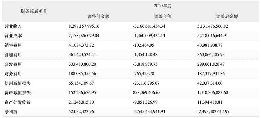 該公司經(jīng)調(diào)整后的2020年的營收為51.31億元,營業(yè)成本為57.18億元,凈利潤為-24.93億元。資產(chǎn)情況更是直接由正轉(zhuǎn)負(fù),其中歸屬于母公司股東權(quán)益合計由調(diào)整前的19.56億元,調(diào)整為-22.22億元。