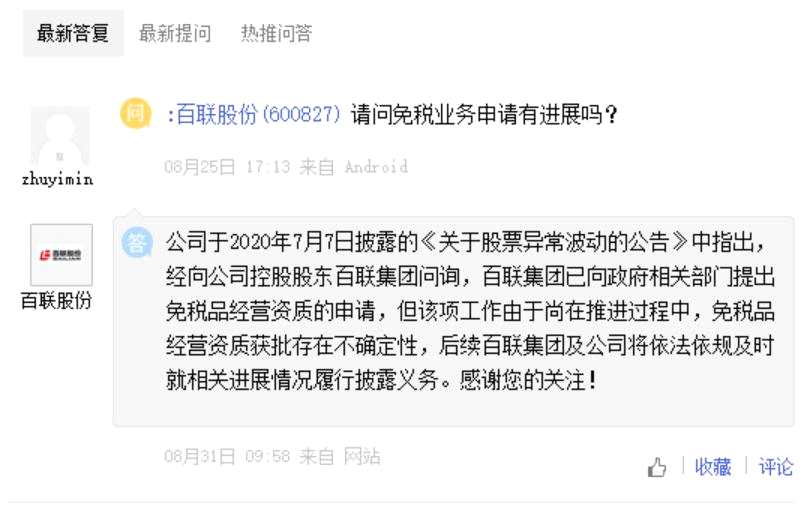 百聯(lián)股份去年7月6日發(fā)布公告稱,經(jīng)向控股股東百聯(lián)集團(tuán)問詢,百聯(lián)集團(tuán)已向政府相關(guān)部門提出免稅品經(jīng)營資質(zhì)的申請。