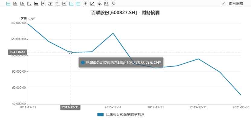 百聯(lián)股份的凈利潤也在下滑。數(shù)據(jù)顯示,公司凈利潤在2013年為10.36億元,2019-2020年的凈利潤分別為9.58億元、7.97億元。