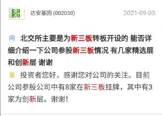 達(dá)安基因(002030)稱目前參股8家新三板掛牌企業(yè),其中有3家為創(chuàng)新層。