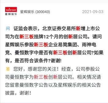 【星輝娛樂(lè)(300043)、股吧】(300043)表示持有易簡(jiǎn)集團(tuán)、雨神電競(jìng)、曼恒數(shù)字三家新三板企業(yè),其中曼恒數(shù)字為創(chuàng)新層公司。
